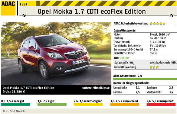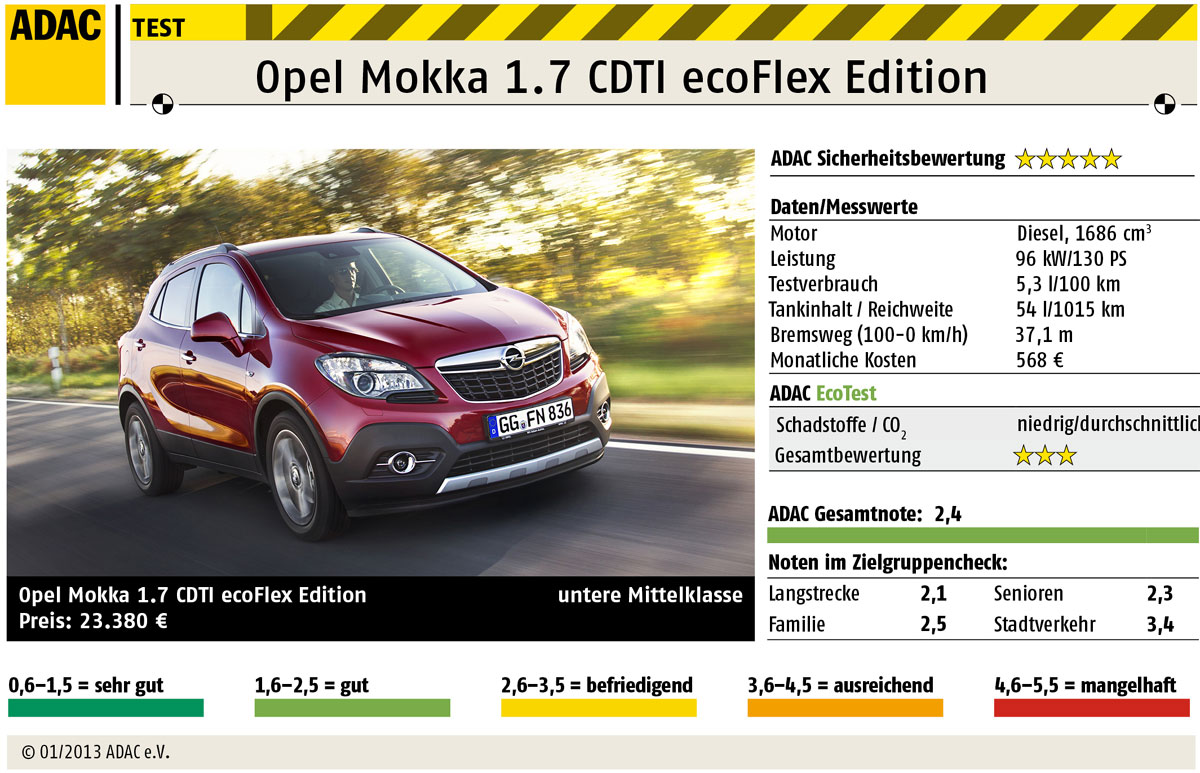 Wem ein klassischer Kompaktwagen zu wenig Ausstrahlung hat, könnte im Opel Mokka eine Alternative finden. Der ist mit 4,28 Meter Länge sogar etwas kürzer als ein Opel Astra, bietet aber einen großen Innenraum, die erhöhte Sitzposition einen guten Überblick über das Verkehrsgeschehen und auch bei der Sicherheit kann das frontgetriebene SUV punkten. Moderne Assistenzsysteme wie Kollisions- und Spurverlassenswarner oder Verkehrszeichenerkennung sind gegen Aufpreis zu haben. Ganz perfekt ist der Opel aber nicht. So bemängeln die ADAC Testingenieure die vielen, schlecht überschaubar arrangierten Tasten im Cockpit. Und mit der Übersichtlichkeit ist es ebenfalls nicht weit her: Besonders nach hinten lässt sich der Mokka nur schwer abschätzen. Die getestete Motorisierung, ein 130 PS starker 1,7-Liter Dieselmotor, sorgt für gute Fahrleistungen (Spitze 187 km/h, 0-100 km/h in 9,9 s), macht den Großstadtcowboy aber zum rauen Burschen. Denn der Diesel nagelt ungewöhnlich laut das geht heute besser. Auch beim Verbrauch liegt der Opel mit gemessenen 5,3 Litern auf 100 Kilometer nur im Durchschnitt der Kompaktklasse. Im ADAC EcoTest, dem Umweltranking des Automobilclubs, bekommt der Mokka daher nur 3 von 5 Sternen. Insgesamt kommt der Opel Mokka auf eine gute Gesamtnote von 2,4 im ADAC Autotest. Autotest: Opel Mokka